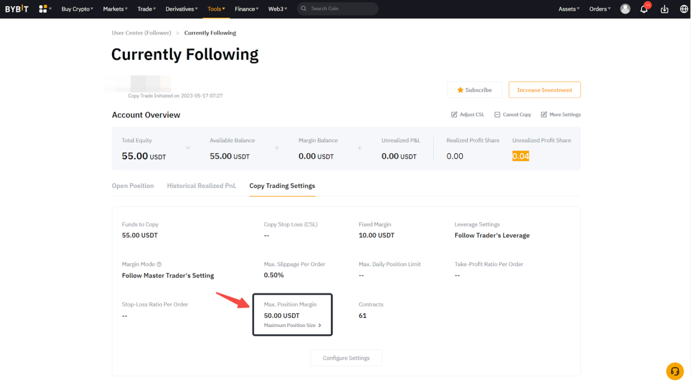 It is essential to highlight that Followers have the flexibility to customize their trading settings according to their preferences and risk tolerance. By adjusting the Max. Position Margin to a lower value, for instance, 20 USDT, the maximum position value will be significantly reduced, making it more achievable to reach the cap. Under such conditions, Followers may encounter instances of failed copy trades due to the restriction on the maximum position value.