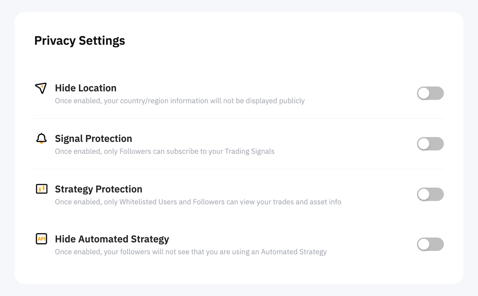 Under Privacy Settings, you can manage your location display, signal protection, strategy protection, or hide your automatic strategy from the public.