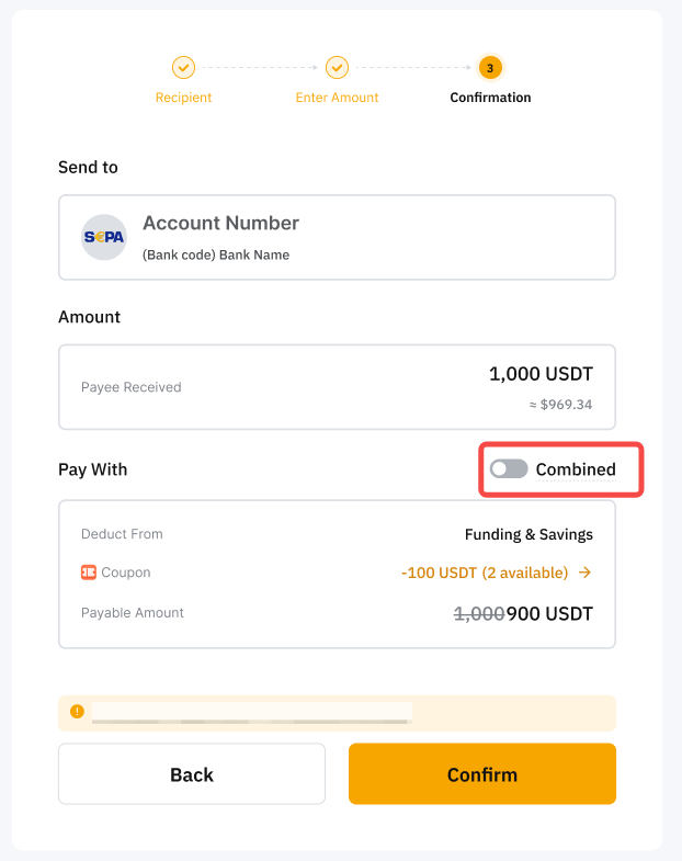 Note: The Combined button allows you to send combination payments using the funds available in your Funding account first, followed by the funds available in your Earn account.