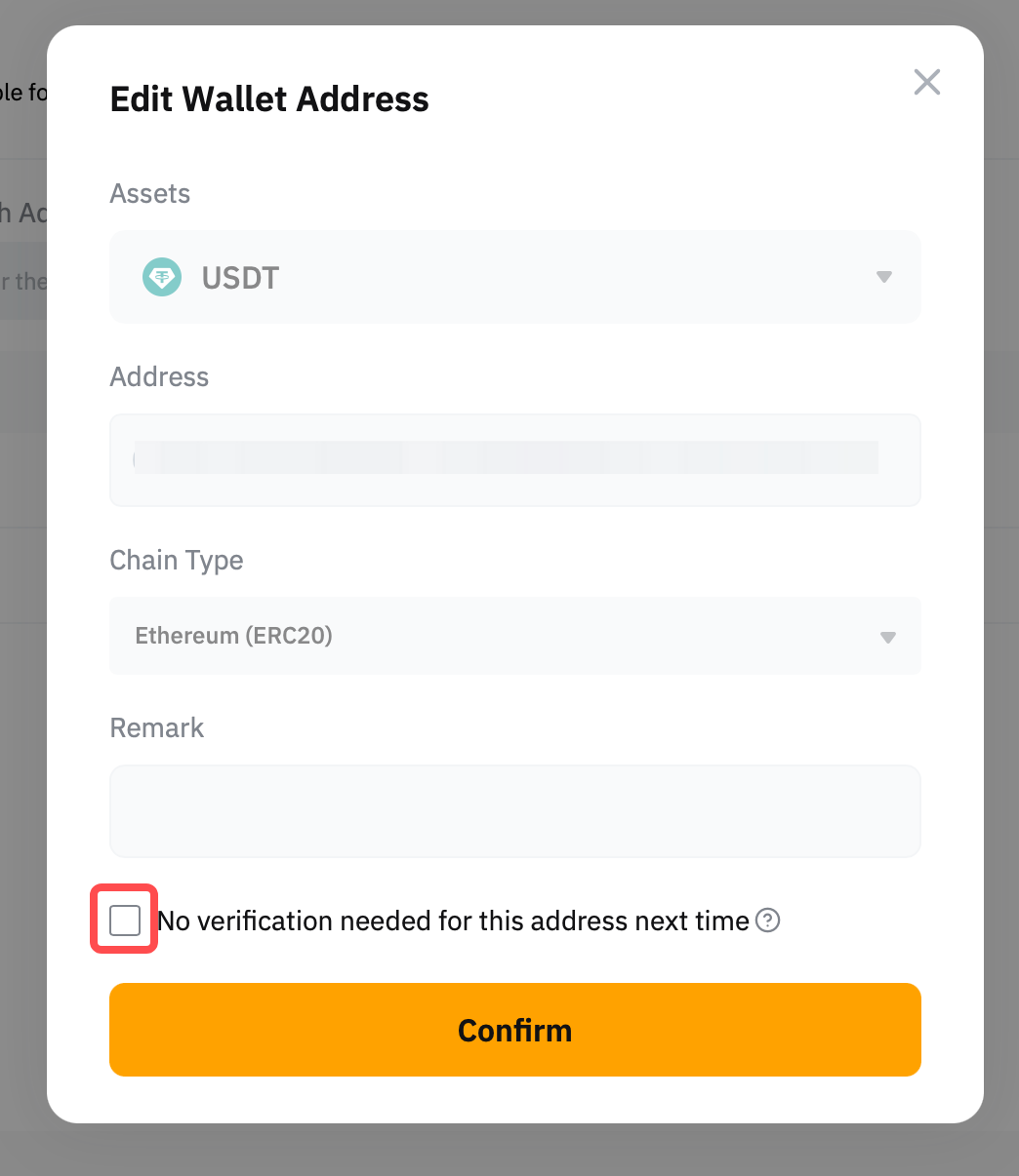Step 3: Enter the correct coin, blockchain and wallet address information for your withdrawal wallet and tick the No verification needed for this address next time option. Click on Confirm once you’re done.