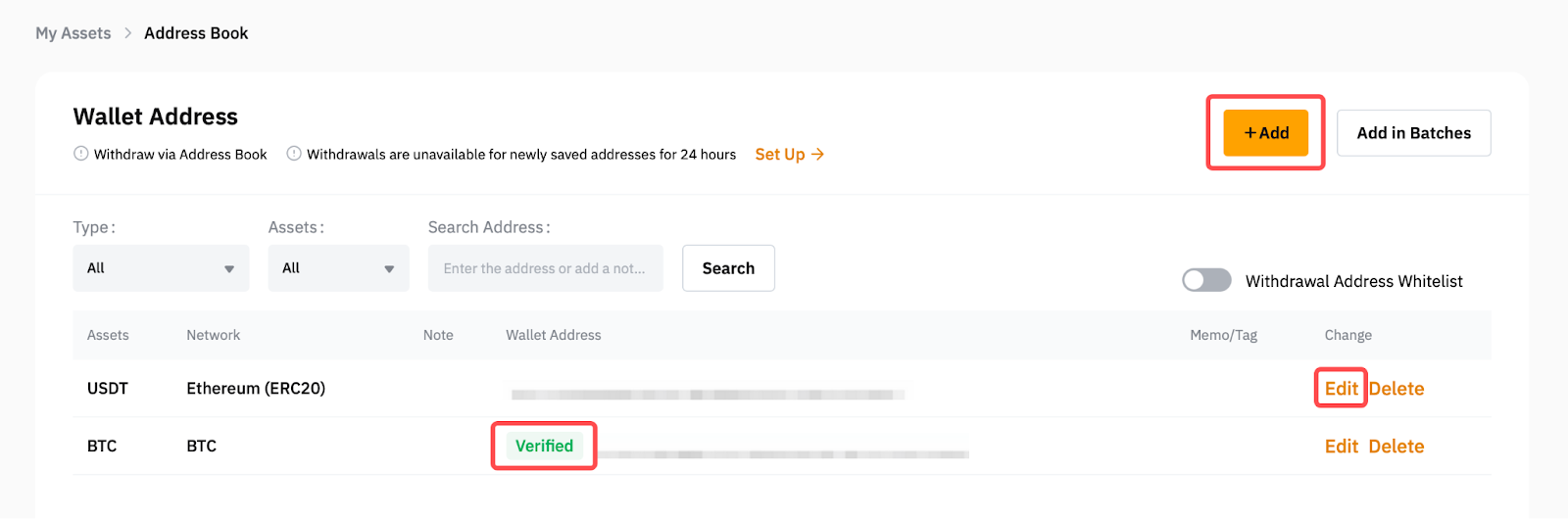Step 2: Please click on Add on the top right corner of the page to add a new wallet address, or select the wallet address that you want to verify by clicking on Edit.