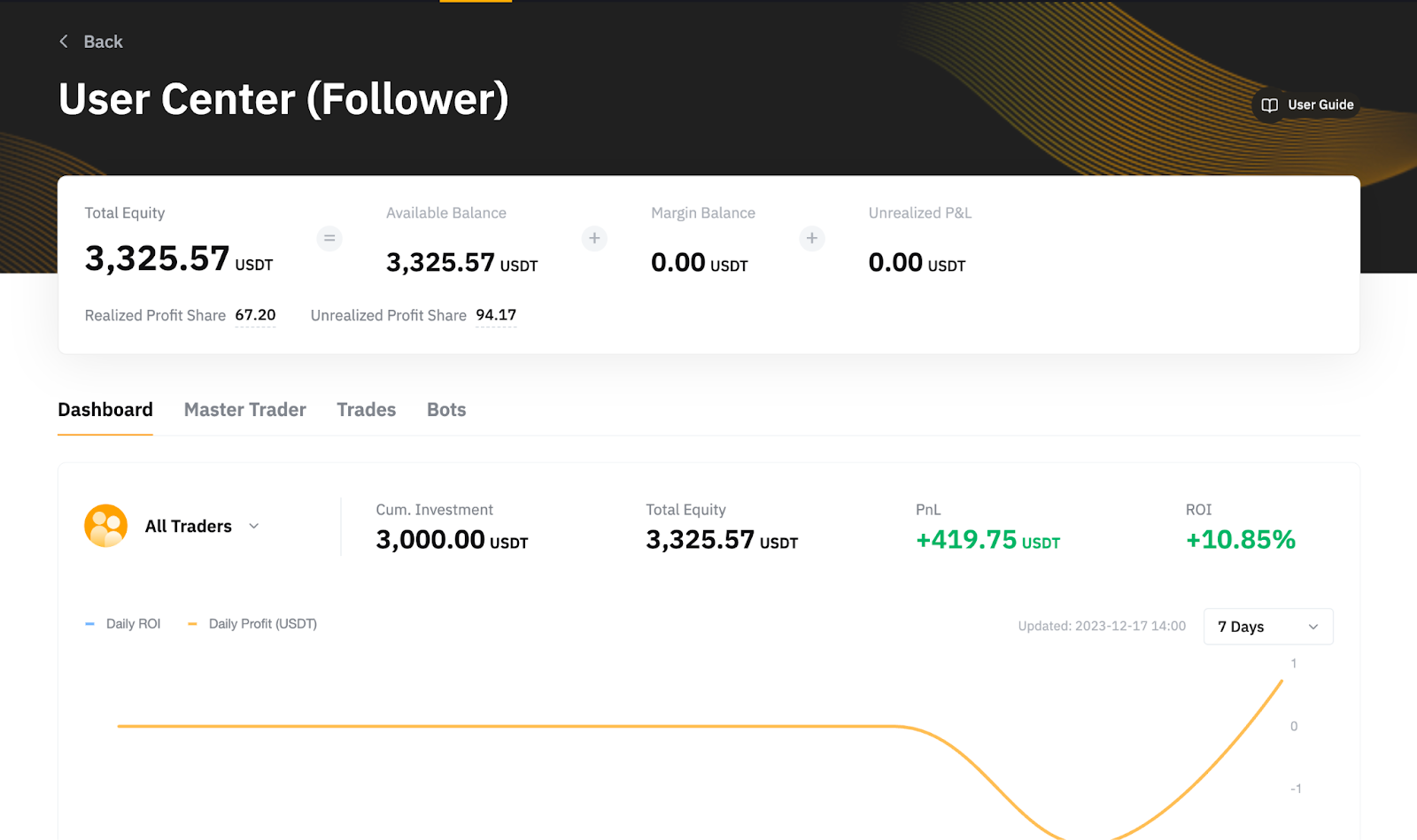 From the Copy Trading User Center (Follower), you can have an overview of your Copy Trading Account, the current or past performance of your followed Master Trader and the order details.