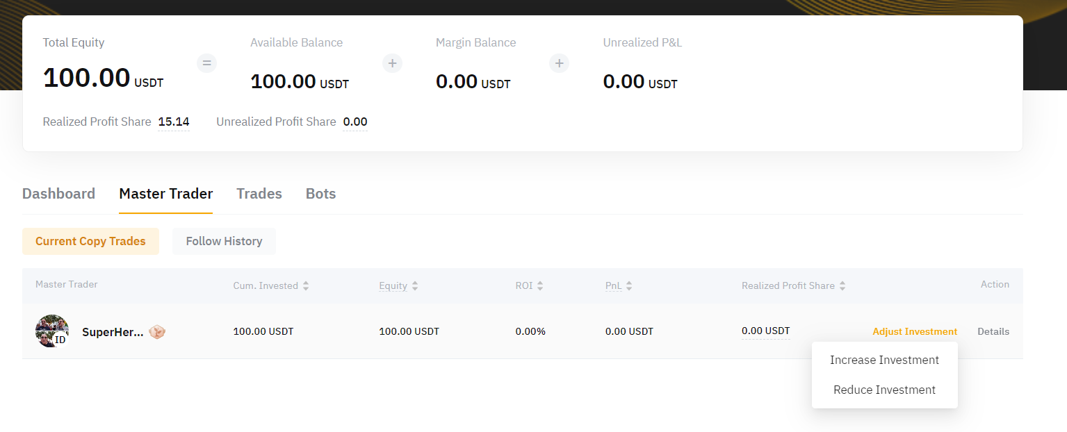 You can view the Current Copy Trades and Follow History of each Master Trader. You can also click on Adjust Investment to increase or reduce your funds to copy the respective Master Trader. Please note that the amount reduced will be automatically transferred to your Funding Account.