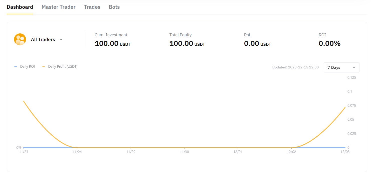 You can view the results of the current P&L and ROI of all following Master Traders, or you can filter each Master Trader to view the results individually.