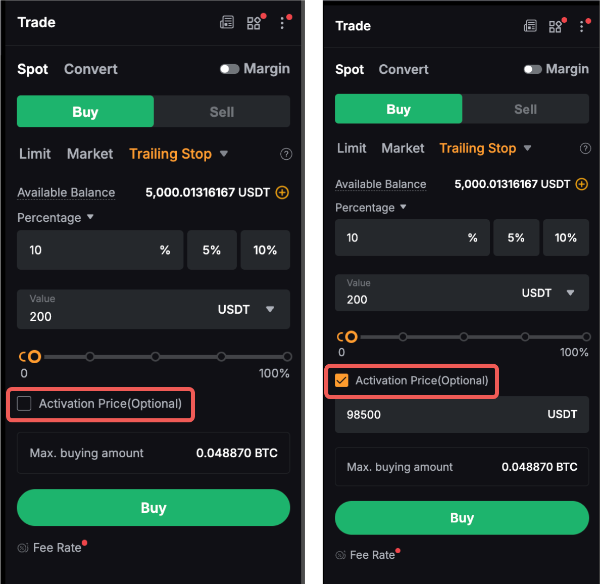 Trailing Stop in Spot and Margin trading is a dynamic order type that functions as an enhanced feature for Buy and Sell. It operates as a stop order that tracks the market price of an asset or position and automatically adjusts the stop order to minimize loss or lock in profits as the price moves in the trader's favor. Once the Trailing Stop is determined, if the market price reaches a certain level and then retraces back by a predetermined amount set by the user, a market order will be triggered.