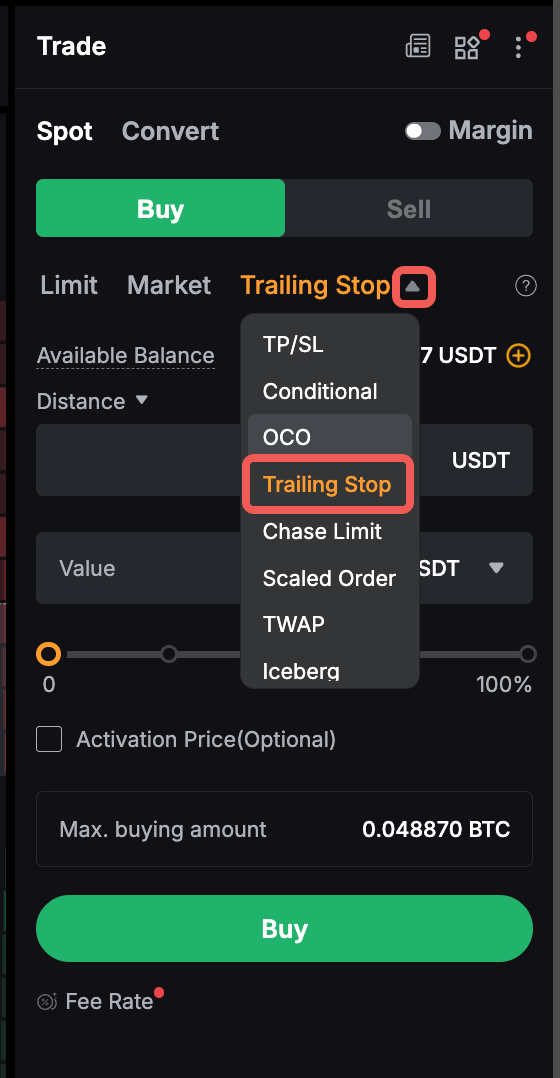 Step 1: Go to the Spot Trading page and select Trailing Stop order.