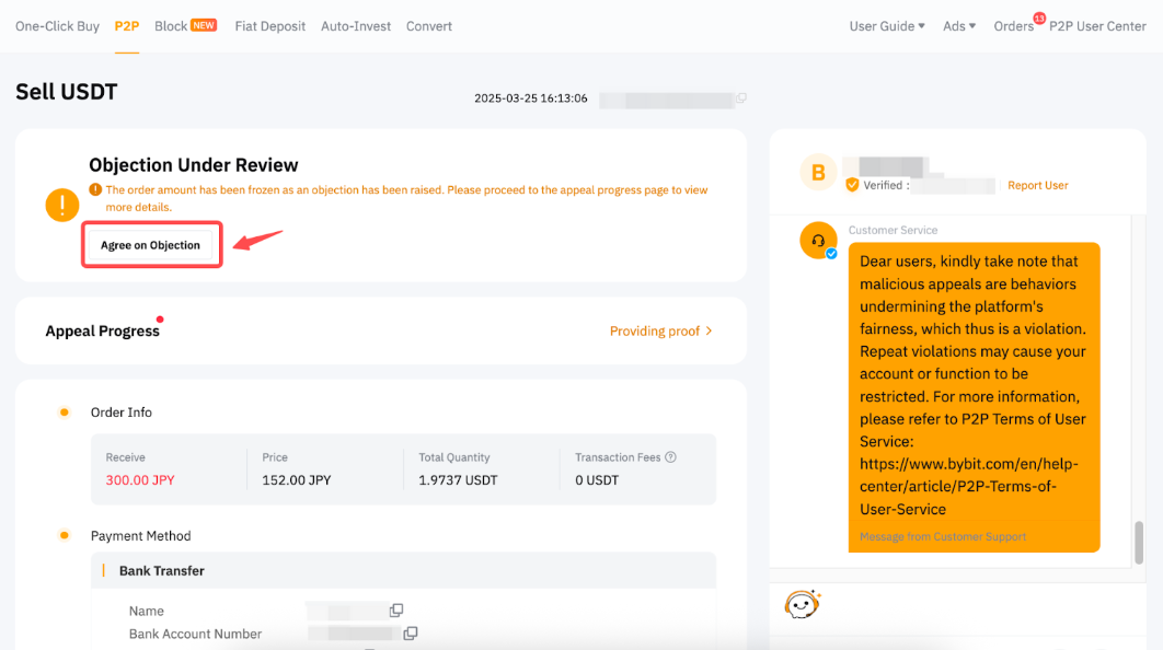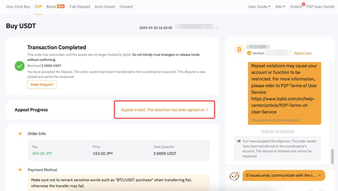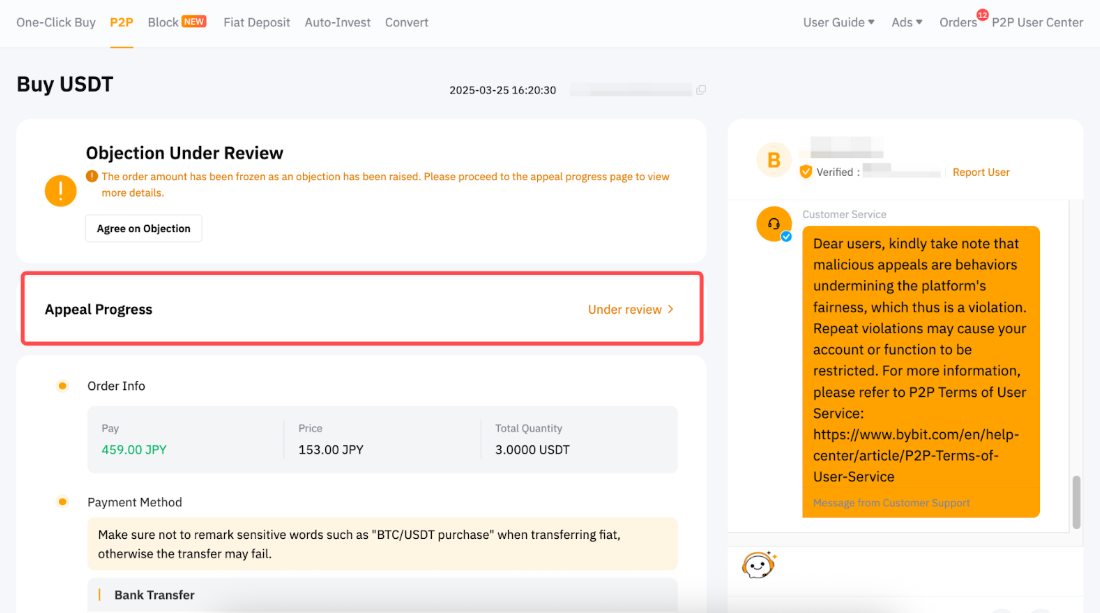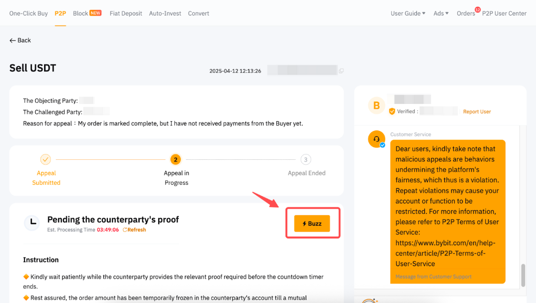 • Las apelaciones maliciosas interrumpirán las operaciones normales en la plataforma y pueden dar lugar a la suspensión de la cuenta. Esto se aplica tanto al Apelante como al Demandado de acuerdo con los Términos de servicio de usuario P2P.