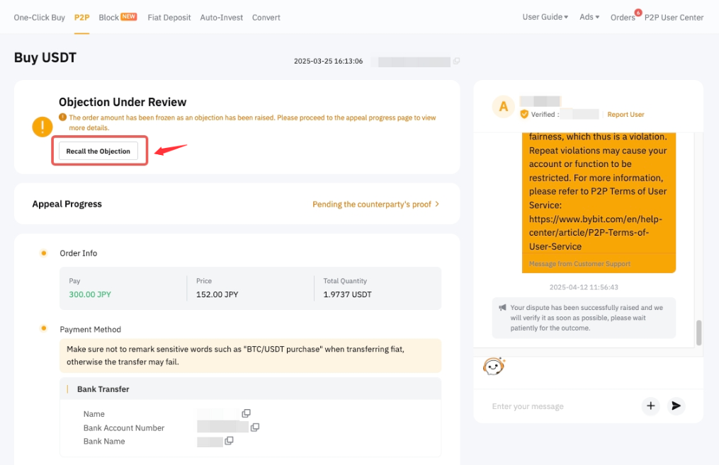 • Frecuencia de apelación: Una orden P2P en curso puede apelarse hasta 2 veces, mientras que una orden cancelada o completada puede apelarse hasta 3 veces después de la cancelación o finalización. No se puede presentar más apelación después de que el equipo de apelación P2P tome la decisión final. Un usuario puede enviar hasta 10 apelaciones de órdenes canceladas o completadas y hasta 4 apelaciones de órdenes en curso al día.