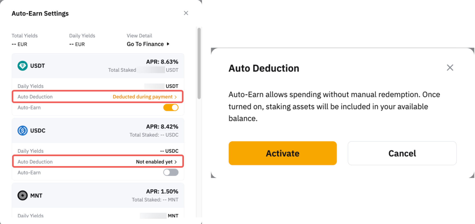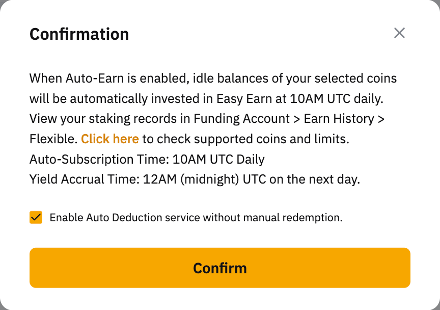 Al hacer clic en el botón de Ganancia automática, el saldo transferible de su activo cripto de pago (que se muestra en cada moneda) en su Cuenta de Financiación se suscribirá automáticamente a los planes de Plazo Flexible al día siguiente.