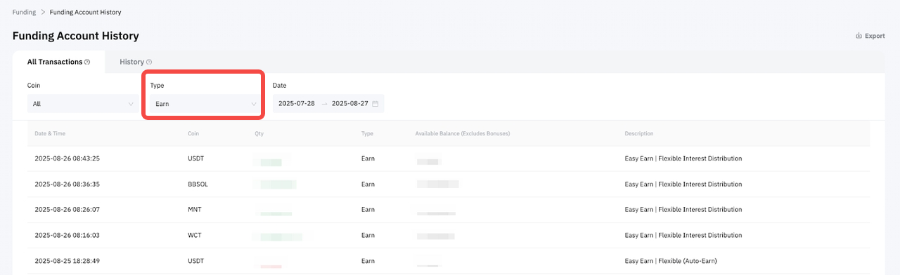 Puede ver sus transacciones exitosas en el Historial de la Cuenta de Financiación en Earn.