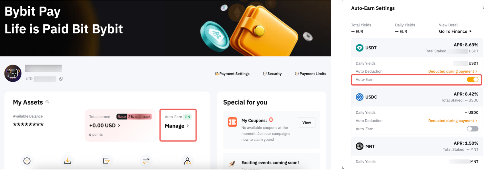 Paso 2: En la página de activos de Bybit Pay, busque el botón de Ganancia automática y actívelo.