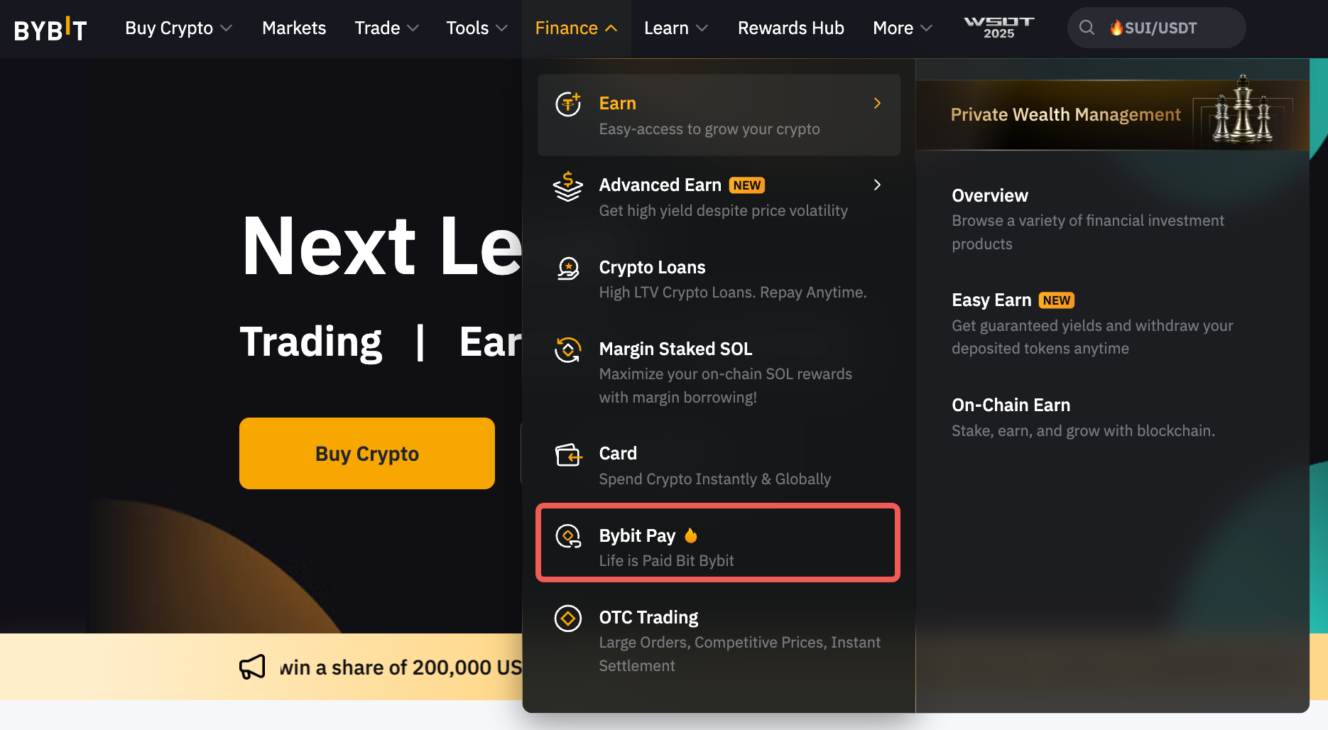 Paso 1: Haga clic en Finanzas en la esquina superior izquierda de la barra de navegación en la página Bybit y, a continuación, seleccione Bybit Pay para entrar en la página Bybit Pay.