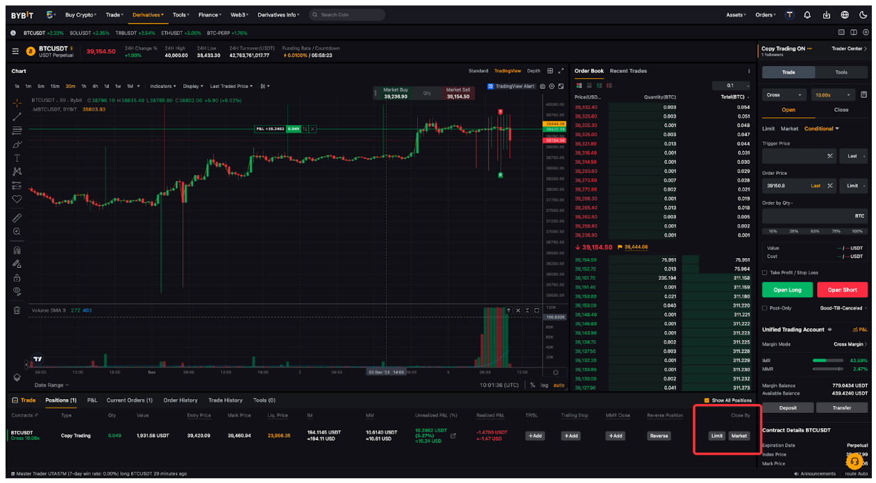 Para cerrar una posición, ve a la pestaña Posiciones y allí podrás cerrar por Límite u Orden de mercado. Si deseas cerrar utilizando otras estrategias como orden condicional, puedes utilizar nuestra función TP/SL integrada (para el modo de cobertura) o ejecutarla desde la zona de la orden en el modo unidireccional.