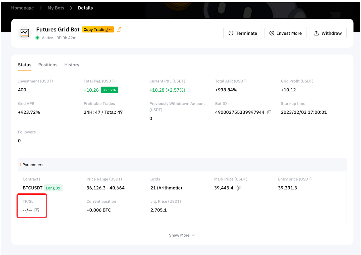 • Si estableces TP/SL en %, cuando tus PyG actuales alcancen el porcentaje establecido, tu bot finalizará y tu posición se cerrará al precio de mercado.
