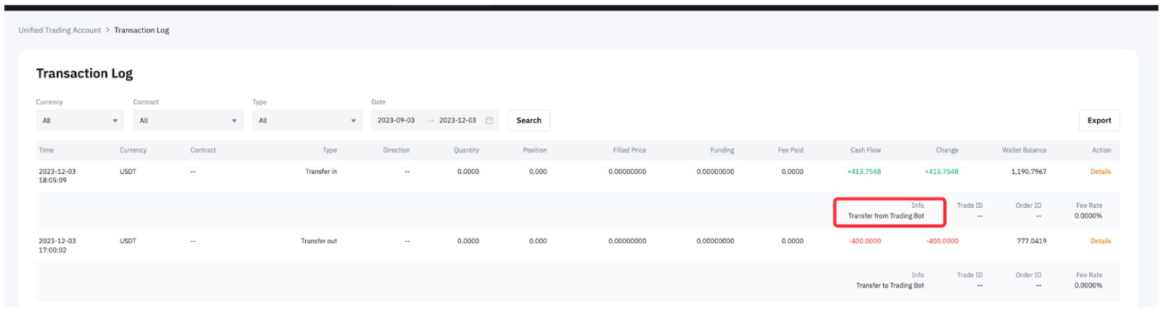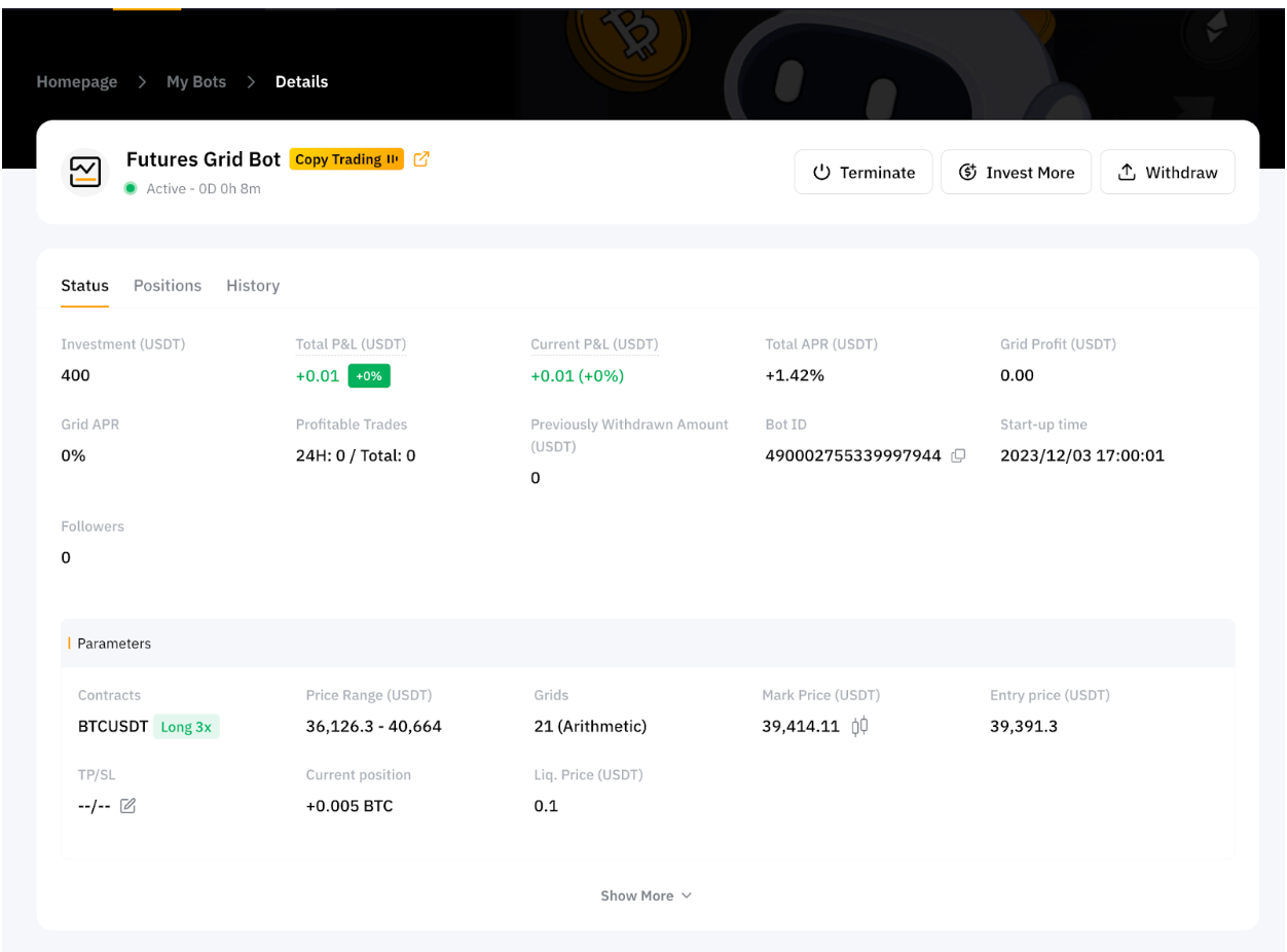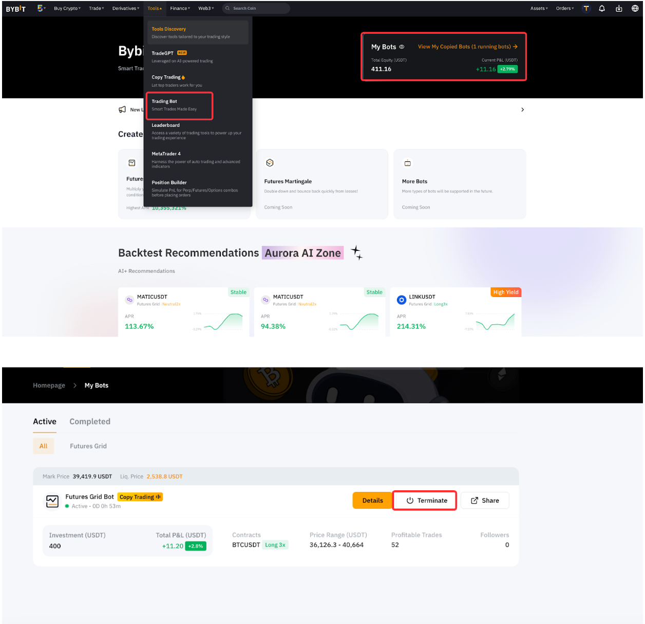Después de finalizar el bot, todas tus órdenes pendientes se cancelarán y tus posiciones se cerrarán al precio de mercado actual. Los fondos se devolverán a tu cuenta de trading unificada (para usuarios de UTA) o cuenta de derivados.