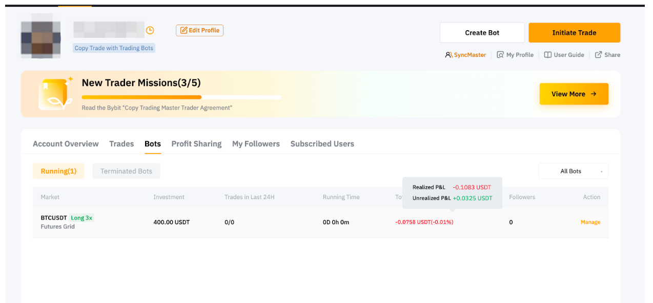 Paso 3: haz clic en Crear bot o Iniciar trade en el lado derecho del Centro del usuario (Master Trader) y se te redirigirá a la página de creación de Trading Bot o a la página de trading de perpetuos de USDT, respectivamente. Actualmente, el copy trading solo admite contratos perpetuos de USDT y grid bots de futuros.