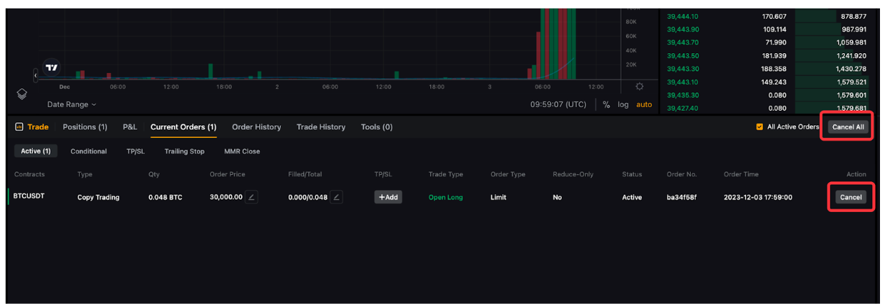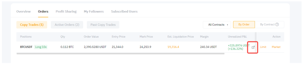 Puedes ver los detalles de la posición o de la orden desde la página de trading de perpetuos de USDT o desde la página Centro del usuario (Master Trader)Trading. Ambas páginas presentarán los mismos datos.