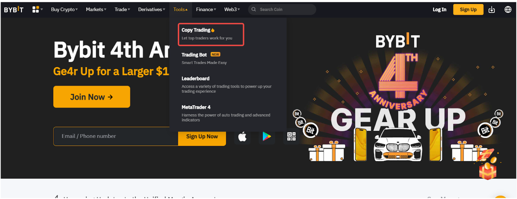 Paso 1: Haz clic en HerramientasCopy trading en la barra de navegación para acceder a la página de copy trading.