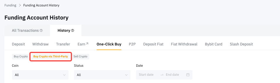 入金記録は、Bybit資産画面のワンクリック購入の下にあるサードパーティ経由で暗号資産を購入タブから確認することができます。