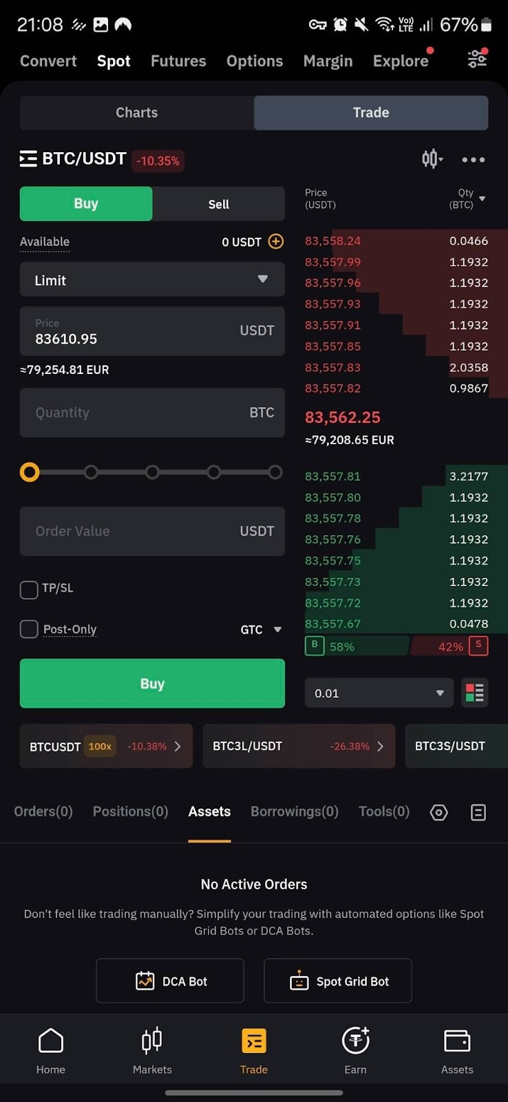 Bybitアプリで、「取引」に移動し、現物取引ページを開き、「取引」をタップします。ポジションタブセクションの右上隅にある注文履歴アイコンをタップして、注文履歴と取引履歴を表示します。