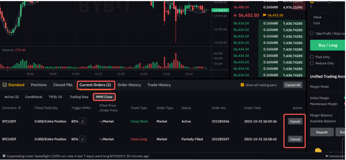 いずれかのポジションについて、アカウントのMMRが、トリガーとして事前に設定したMMRに達した場合、そのポジションは成行注文により完全に決済されます(決済価格は利用可能な最良価格となります)。なお、MMR決済注文が行えるのは、現在のところUTAでクロスマージンモードを利用する場合に限ることにご注意ください。また、MMR決済注文の対象となる取引はUSDT無期限、USDC先物および無期限契約に限ります。