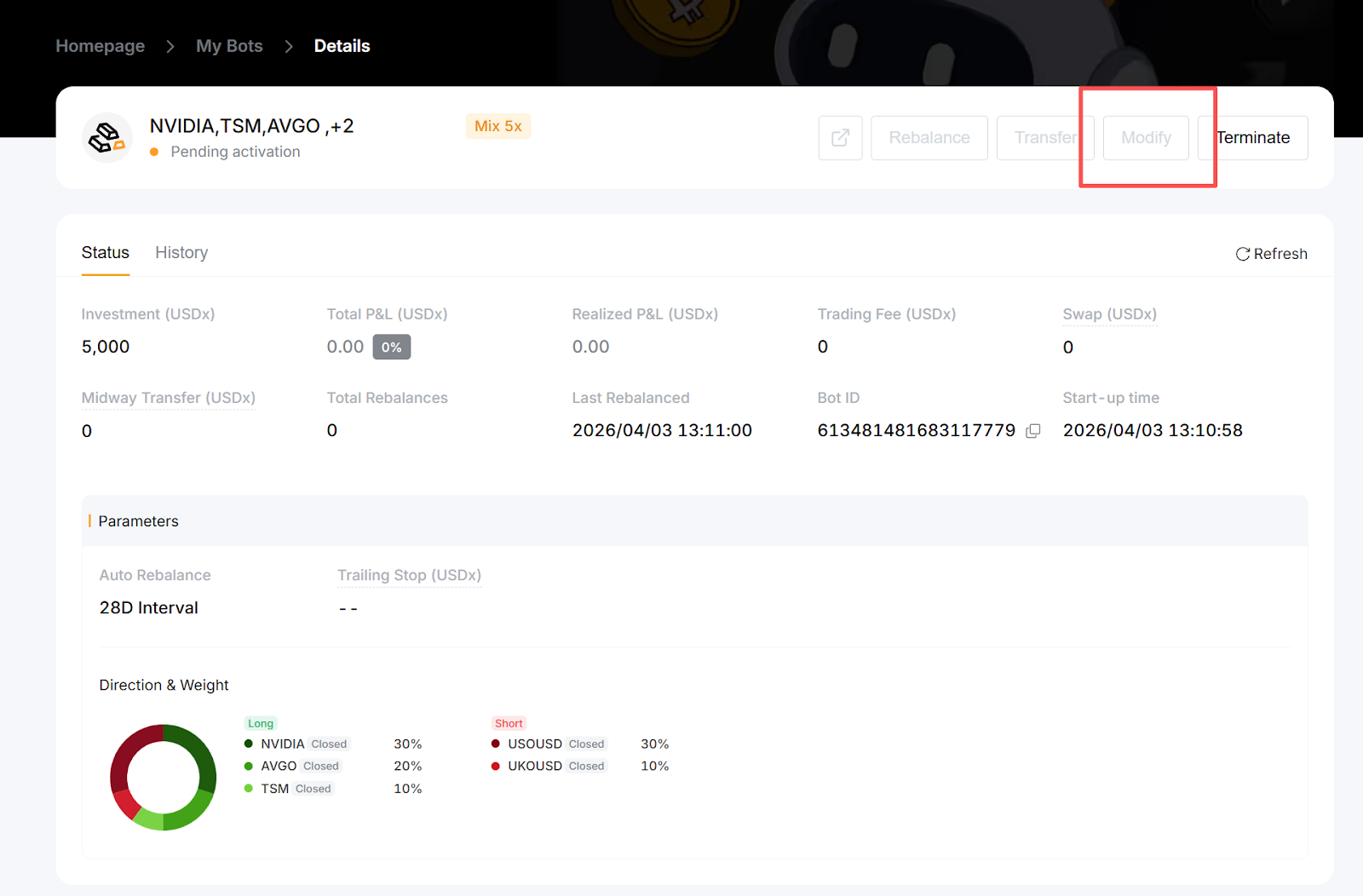 — If any contract in the bot is not tradable due to market closure, added funds will not trigger rebalancing and will be used as margin only.
