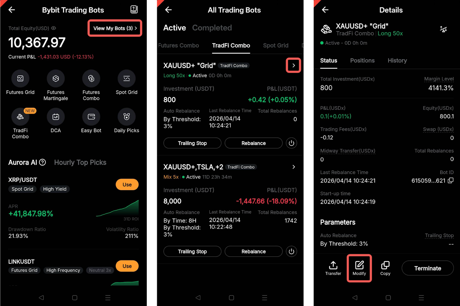 Yes, you can modify the parameters of an active TradFi Combo Bot from the Bot Details page. On the website, simply go to My Bots → Details → Modify.