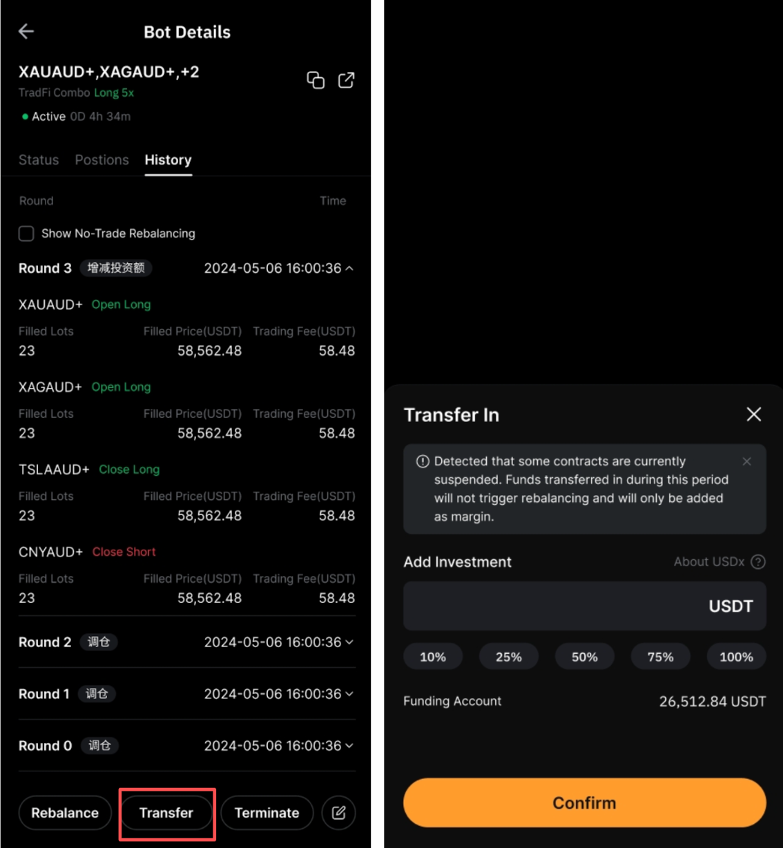 You can add funds to your active TradFi Combo Bot via the Transfer button on the Bot Details page. Simply enter the amount or use the percentage bar to adjust your investment.