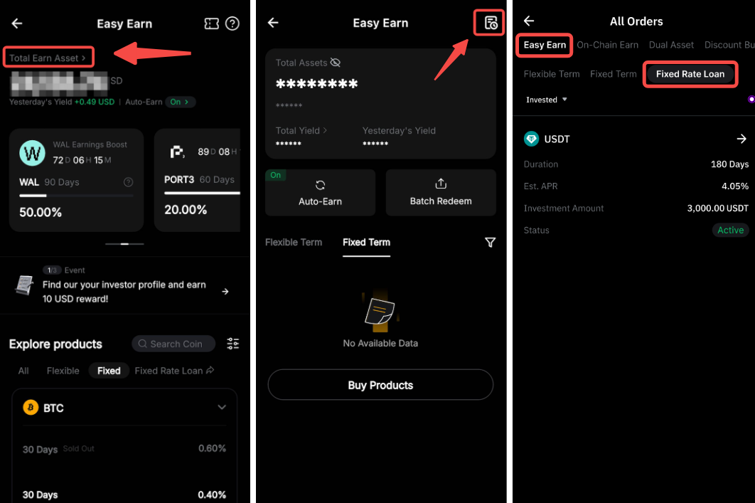 If you are accessing via the app, go to Earn → Easy Earn → Total Earn Asset → History icon → Easy Earn: Fixed Rate Loan.