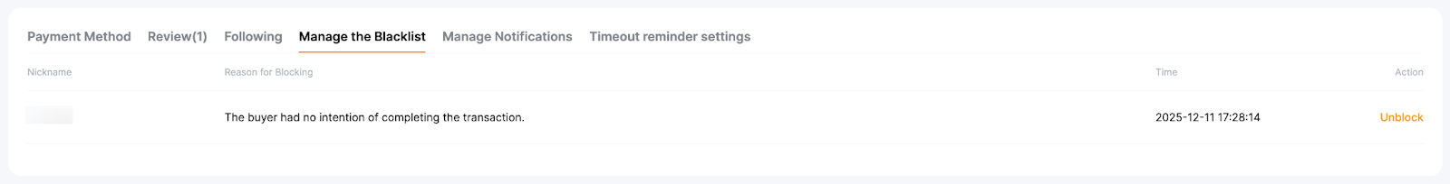 Display the traders you’ve blocked with the reason and you can unblock them on this page.