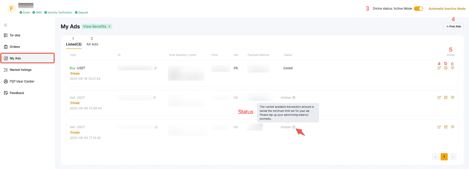 The Merchant dashboard on P2P helps you, as an advertiser, to manage your ads and orders more efficiently. It includes the list such as To-dos, Orders, Ads, Market Listings, and the P2P User Centre. However, please note that this feature is currently only available on the website.