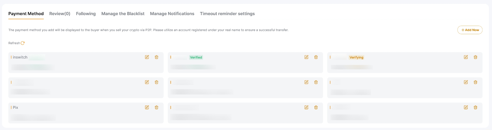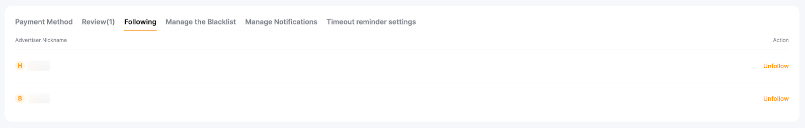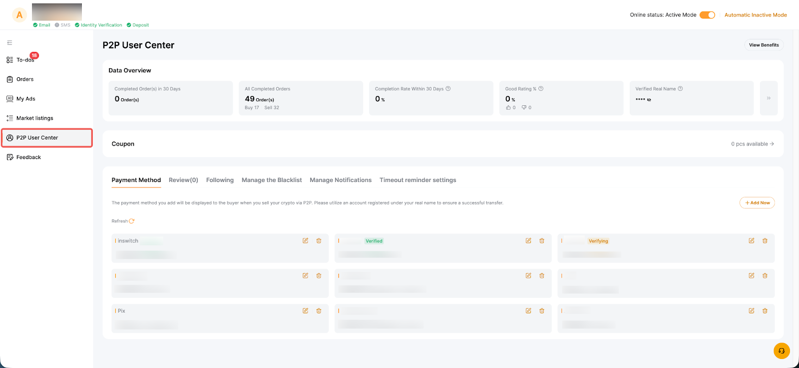 In the P2P User Center, you can view an overview of your trading performance and manage your payment methods, reviews, followings, blacklist, notifications, and timeout reminder settings.