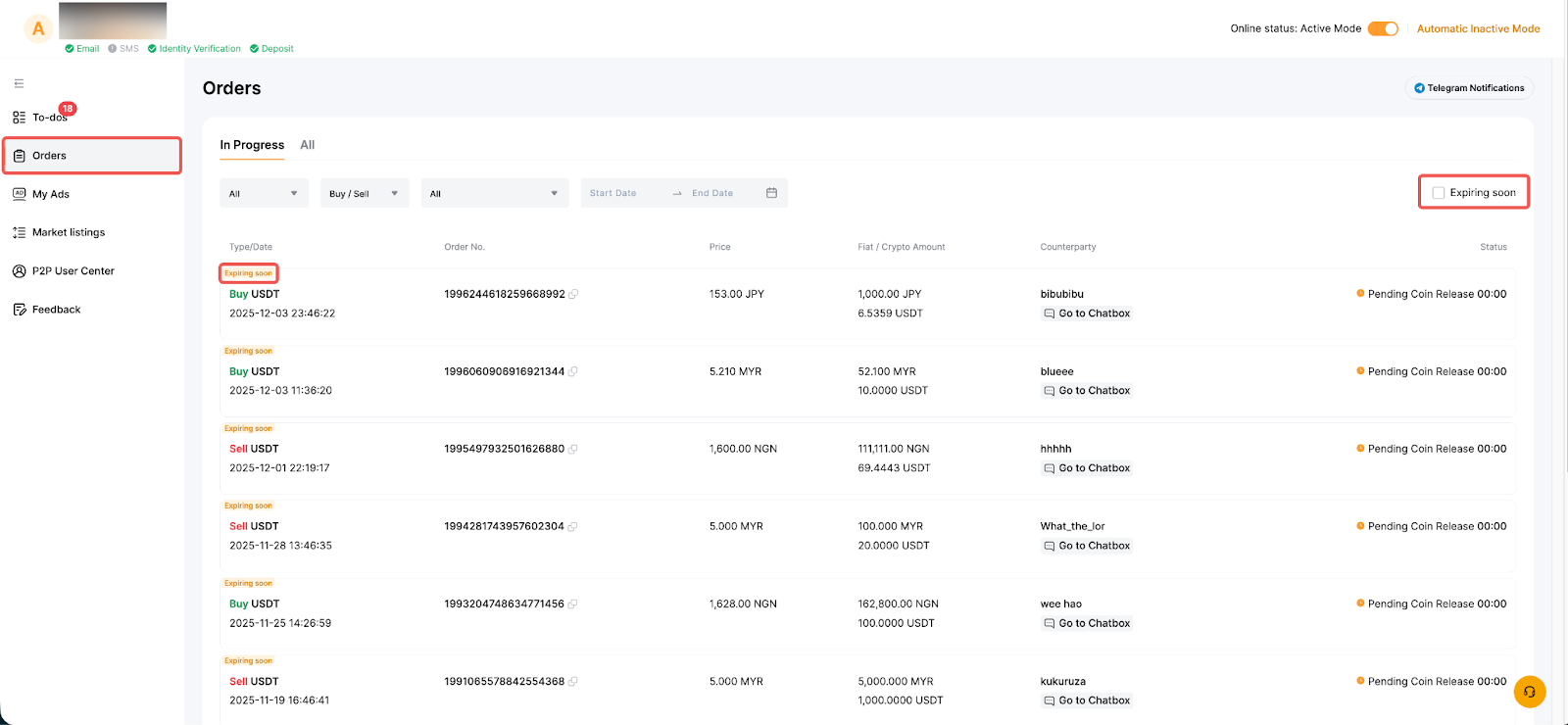 Note: Turn on Timeout Reminder Settings in the P2P User Center to filter and view your “Expiring Soon” orders. See Timeout Reminder Settings for more info.