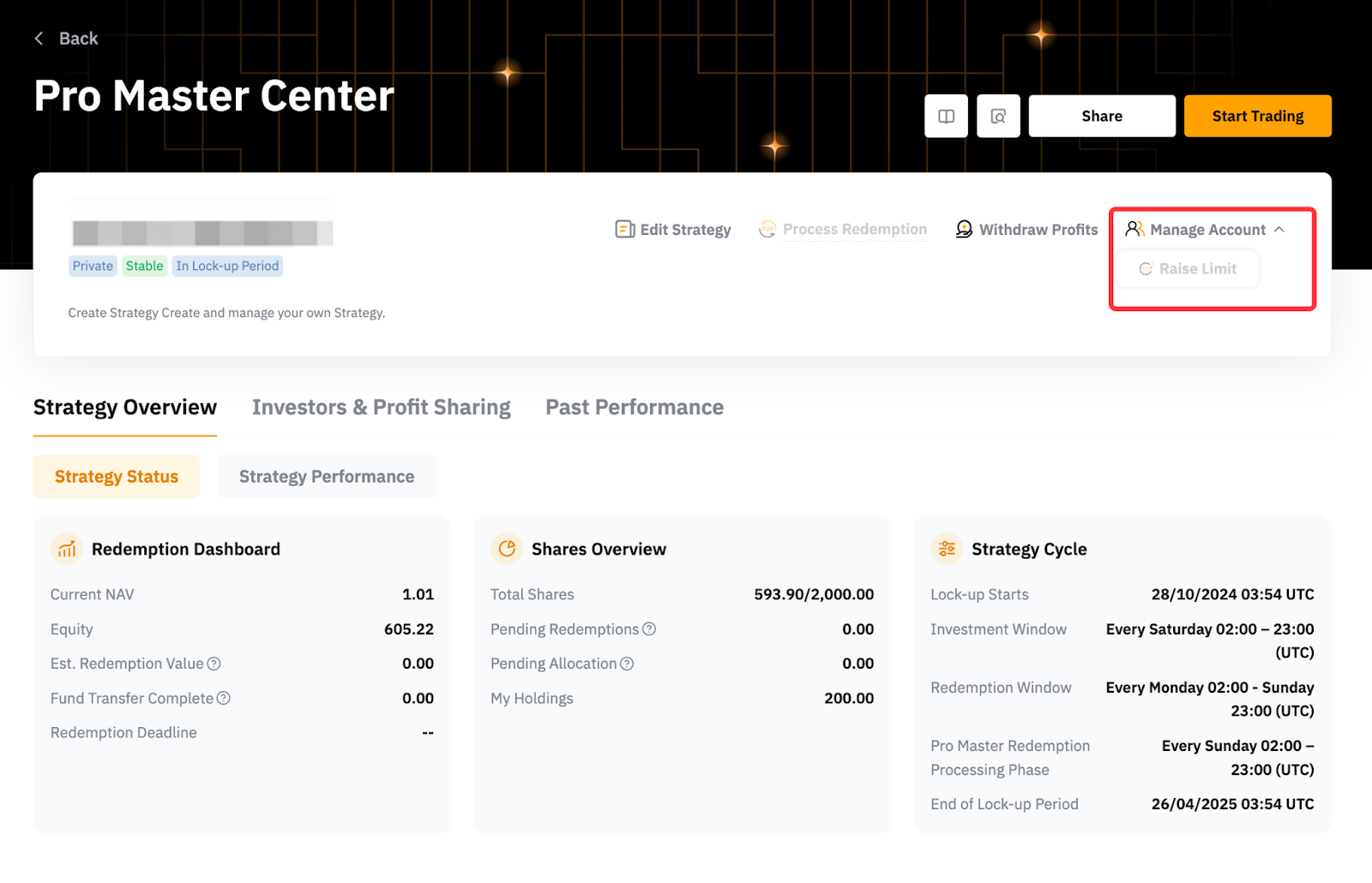 You can raise the share limit to accommodate more investors’ funds during the Investment Window from Manage Account → Raise Limit. When you choose to increase the capacity, you must also contribute the additional Master Balance to complete the expansion successfully.