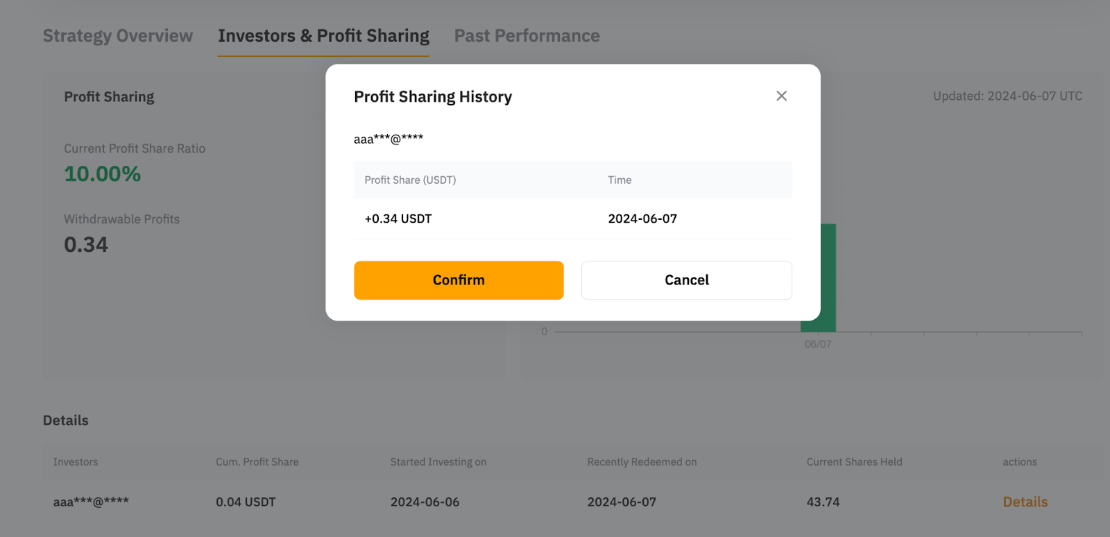 Step 2: On the pop-up window, update the parameters you wish to change, i.e., Profit Sharing ratio, and click Confirm.