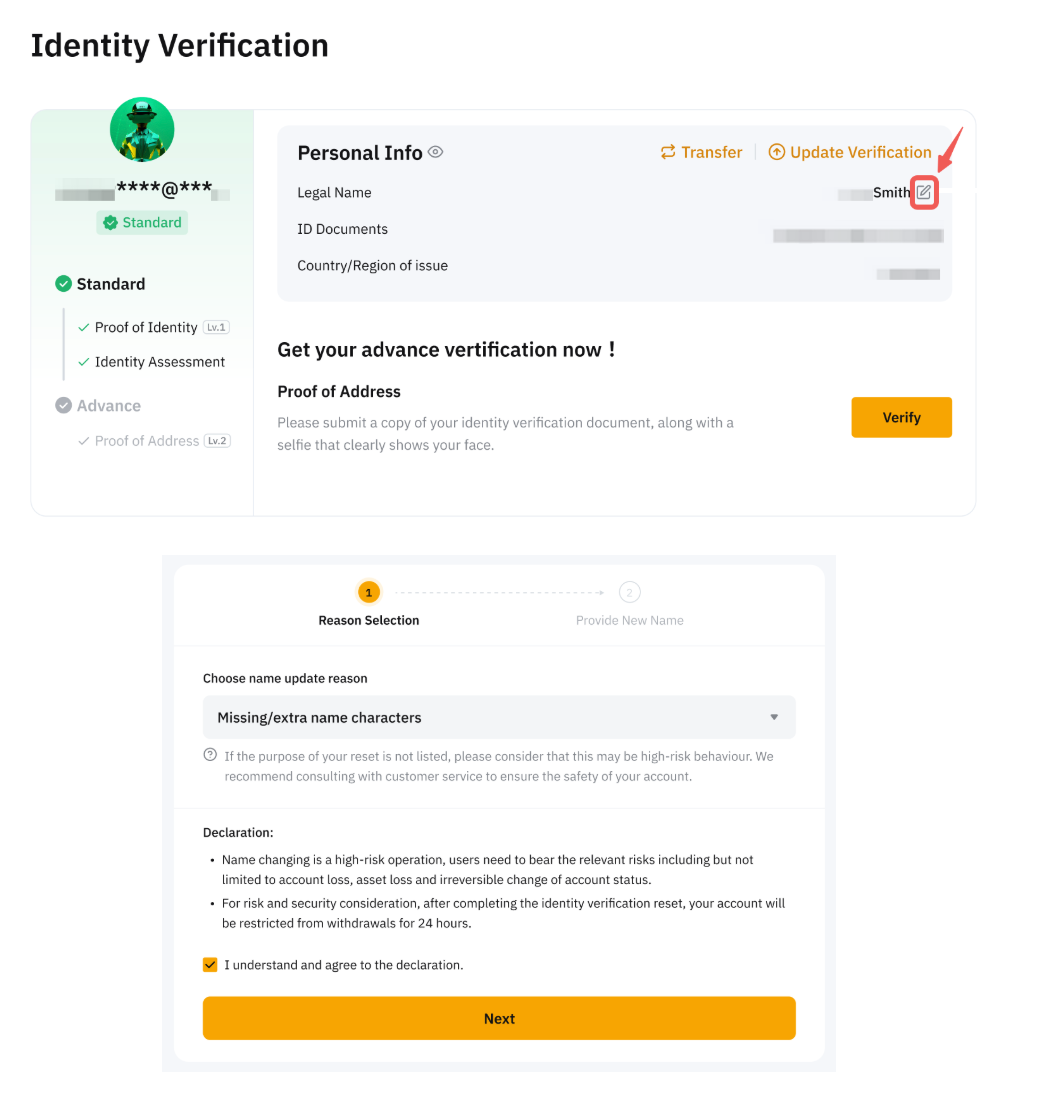 You can update your KYC name by clicking on the Pencil icon on the Identity Verification page. Then, you will need to select the reasons, complete the security verification, and provide the correct name. The process usually takes about 5 minutes. However, it may take up to one (1) working day for further review. If the processing time has exceeded, you can check the status on Support Hub or contact the Compliance Team directly at complianceops@bybit.com.