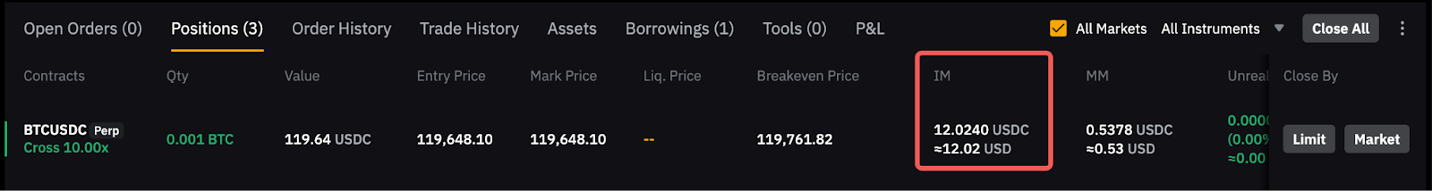 Please note that the initial margin shown in the position tab includes the taker fee, which may be incurred in closing the position.