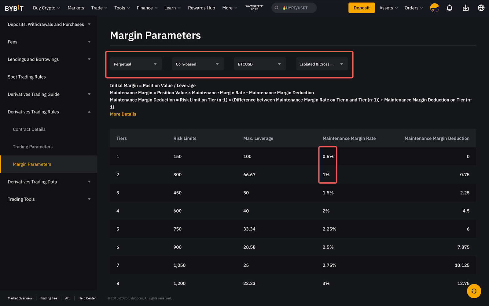 The MMR required for each risk limit tier and the Maintenance Margin Deduction amount can be easily found on the Margin Parameters page.