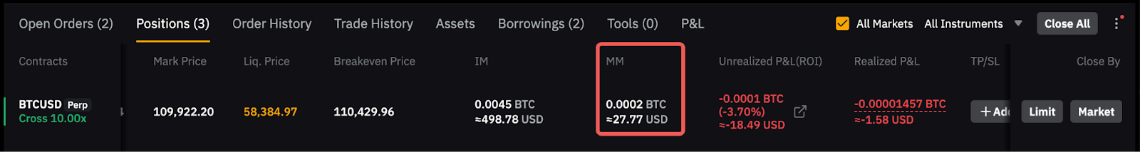 You may notice that the MM displayed on the position tab will be higher due to the reason that it includes the estimated fee to close the position.