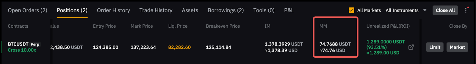 In this case, the total maintenance margin displayed on the position tab will be 11,242 USDT (11,000 USDT + 242 USDT).