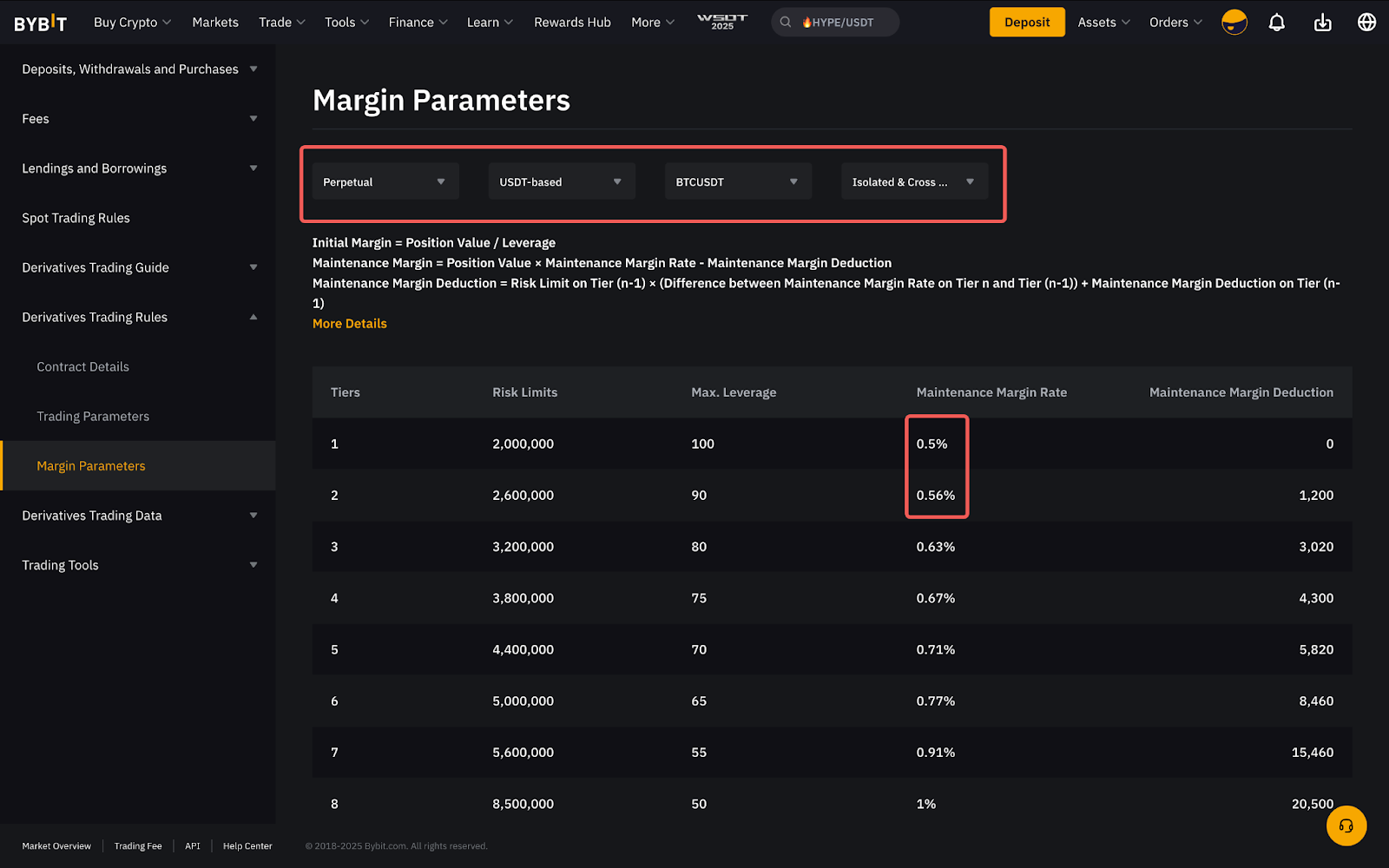 The MMR required for each risk limit tier and the Maintenance Margin Deduction amount can be easily found on the Margin Parameters page.