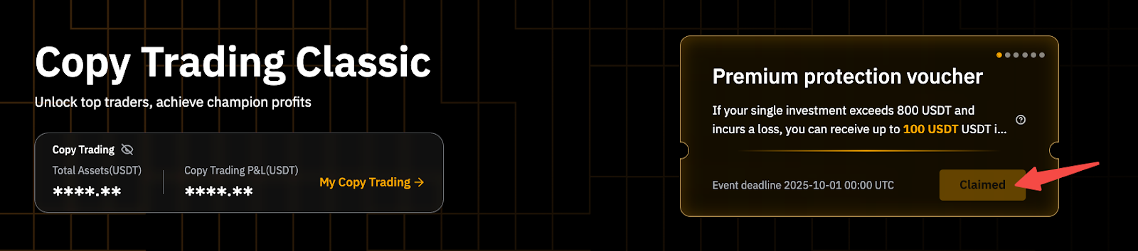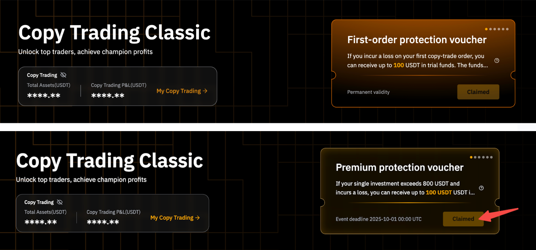 • Voucher de proteção premium: Ele pode ser reivindicado uma vez a cada trimestre no canto superior direito do Copy Trading Classic ou Copy Trading TradFi. No mesmo trimestre, você é elegível para remuneração – até 100 USDT – por perdas de um único Master Trader elegível. Esse benefício só pode ser usado uma vez por trimestre.