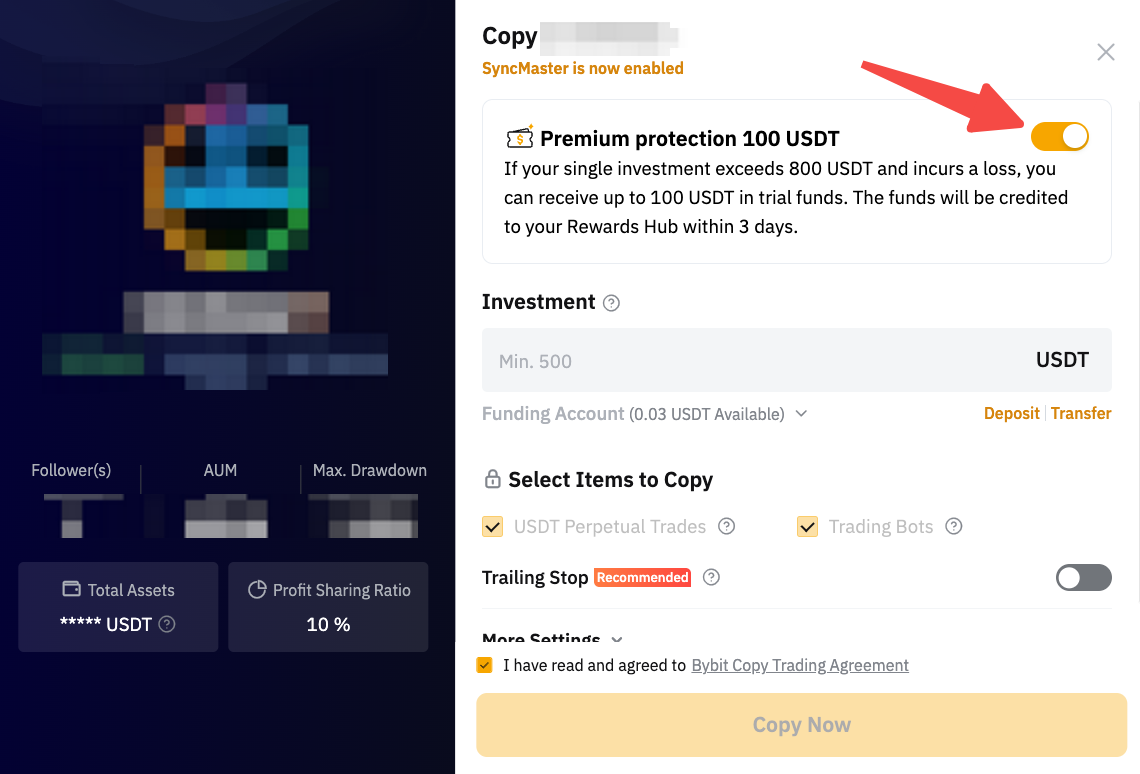 2. Para o Voucher de Proteção Premium, certifique-se de ativar a alternância na janela de investimento e investir pelo menos US$ 800 em um único investimento para ativar o voucher.