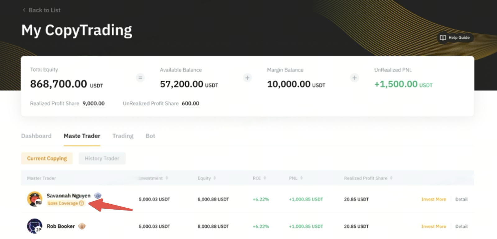 • Se um Master Trader já tiver negociações abertas e Jason estiver incorrendo em uma perda de 10 USDT, ele então reivindica o Voucher de Proteção Premium.