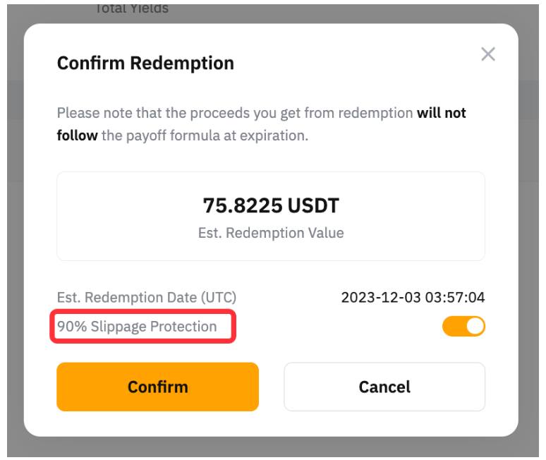 A Proteção de Derrapagem de 90% na janela de confirmação de resgate do seu Double-Win significa que se o valor real de resgate for inferior a 90% do valor estimado, o resgate falhará. Seu plano Double-Win, no entanto, permanecerá inalterado e válido. Essa configuração é habilitada por padrão.