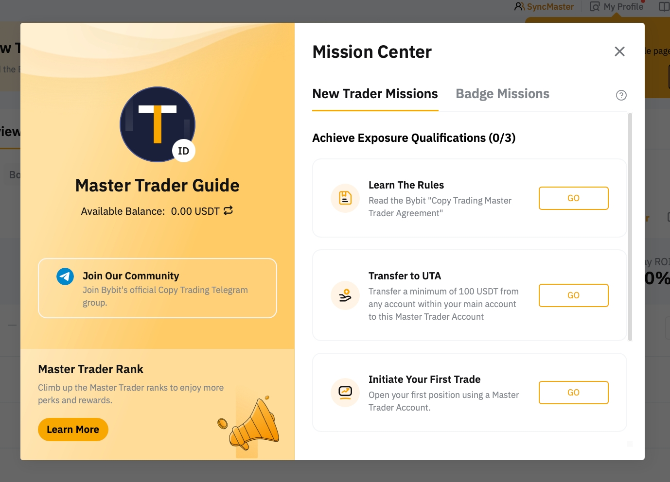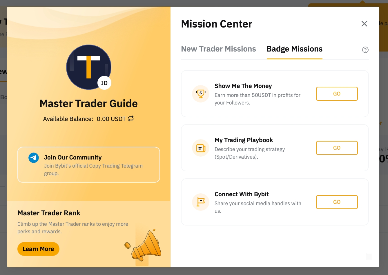 Ao se inscrever com sucesso para ser um Master Trader, é necessário concluir as novas missões de Master Trader localizadas na Central de missões para aparecer na página Recomendado para Copy Trading da Bybit.