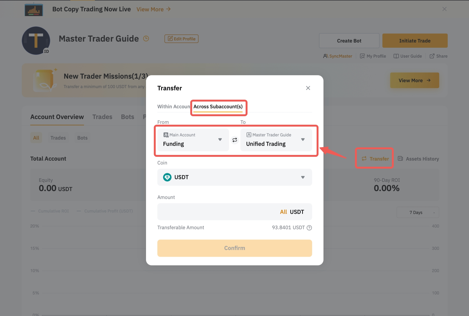 • Transferir para a conta de Master Trader: Transfira pelo menos 100 USDT de qualquer conta em sua conta principal para esta conta de Master Trader