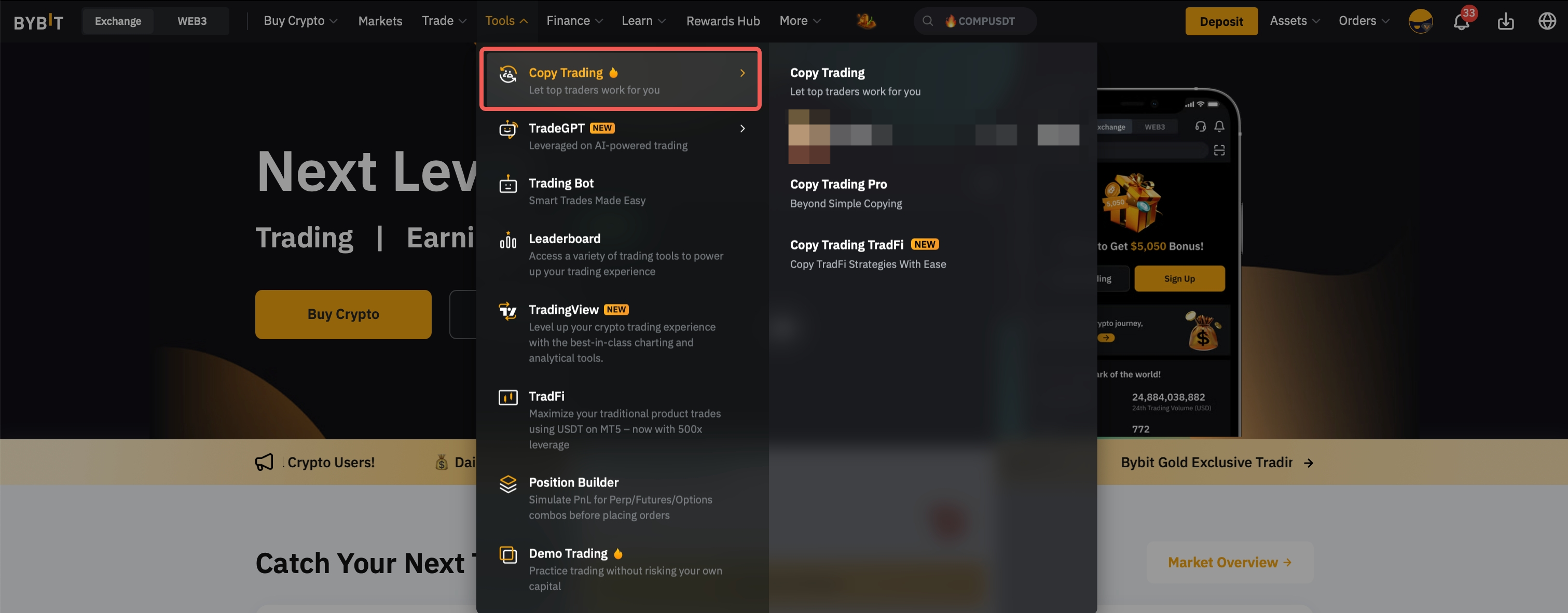 2º passo: Clique em Ferramentas Copy Trading na barra de navegação para entrar na página Descobrir Top Traders.