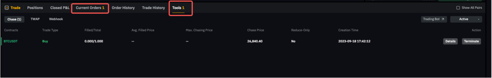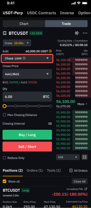 Veja um exemplo: Digamos que um trader envie uma ordem limitada de preço long com a quantidade de 20.000 XCN, no preço atual de Bid1 de 0,00123 USDT. Após enviar a ordem, o preço de mercado e o preço Bid1 mudam para 0,00124 USDT, a ordem limitada por preço é atualizada para 0,00124 USDT, para corresponder ao novo preço da Bid1, e aguarda execução.