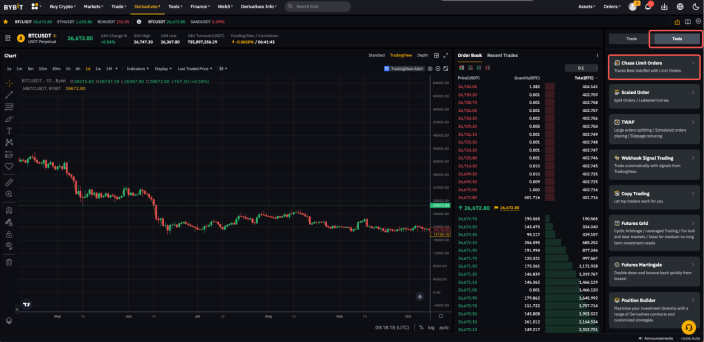 3.º passo: no site da Bybit, clique na guia Ferramentas e selecione Ordens limitadas por preço